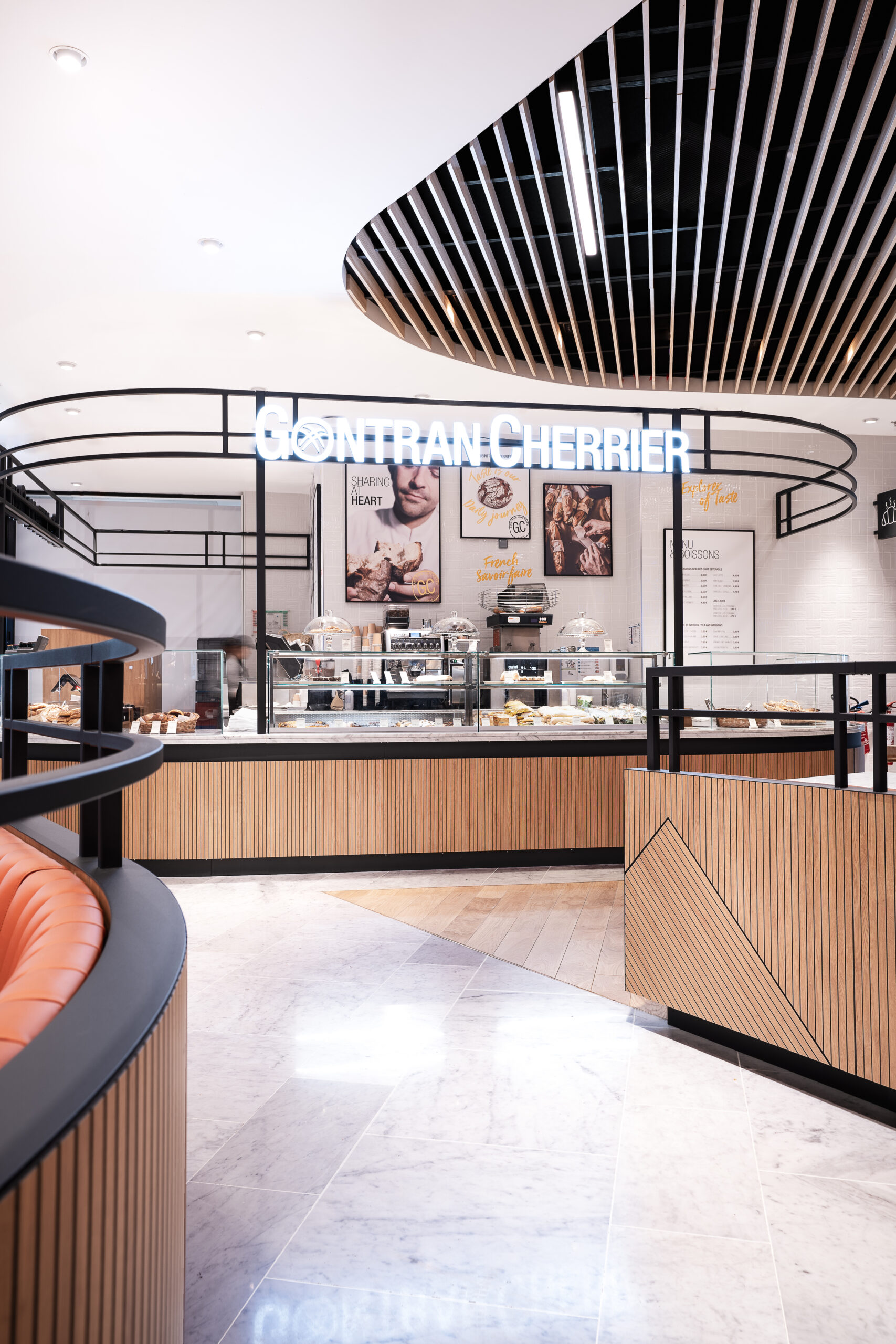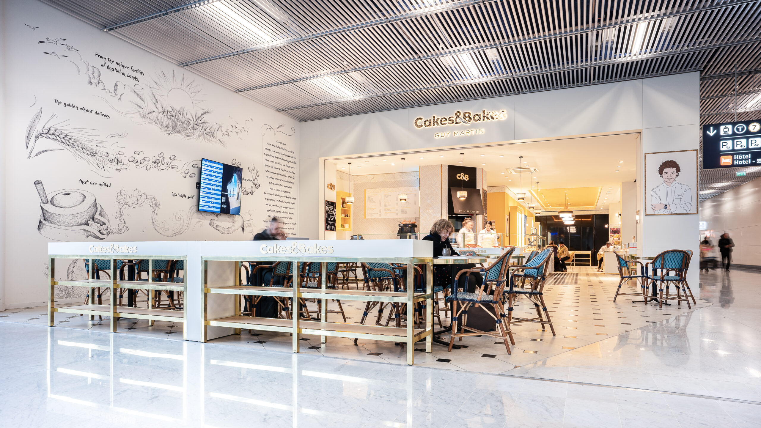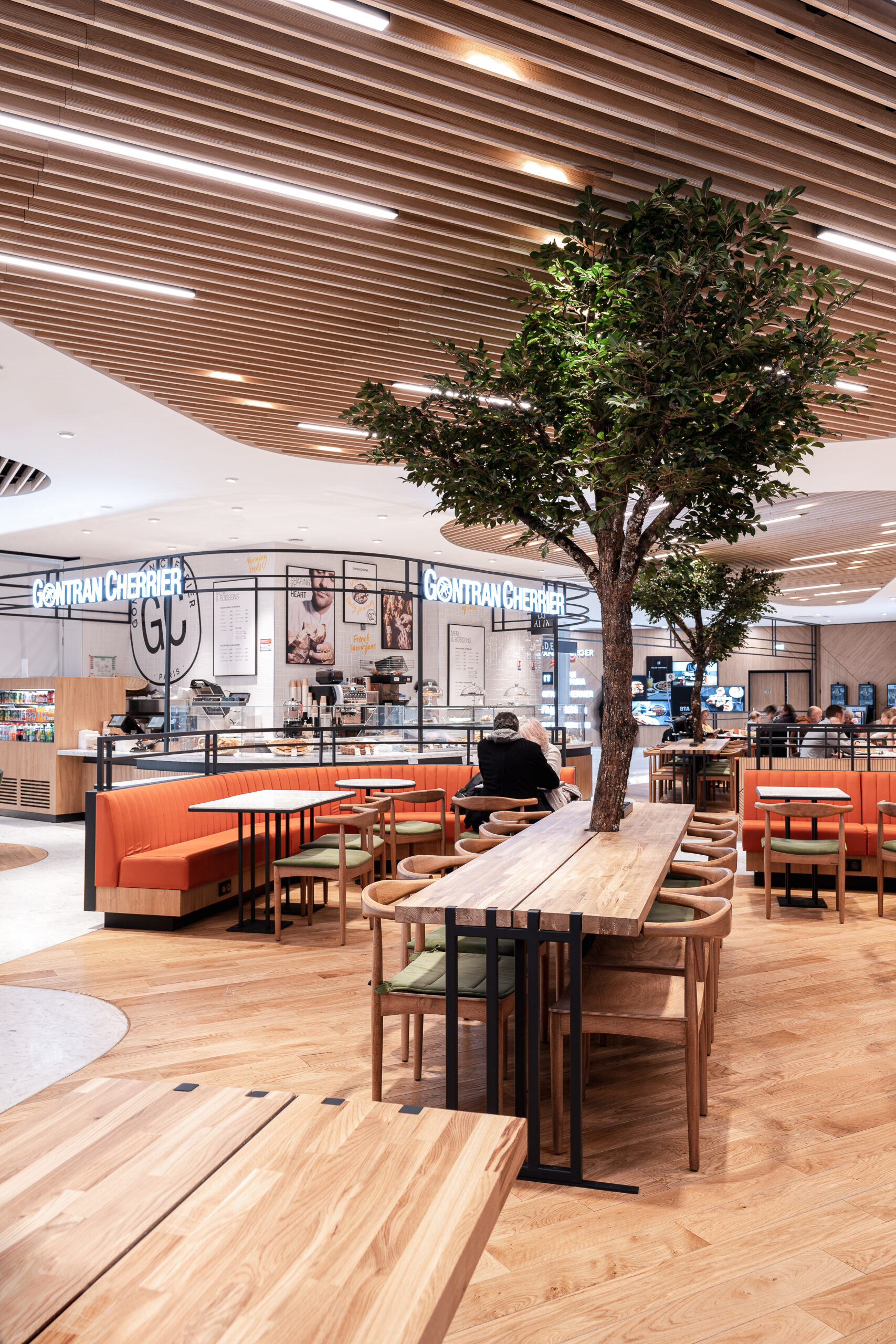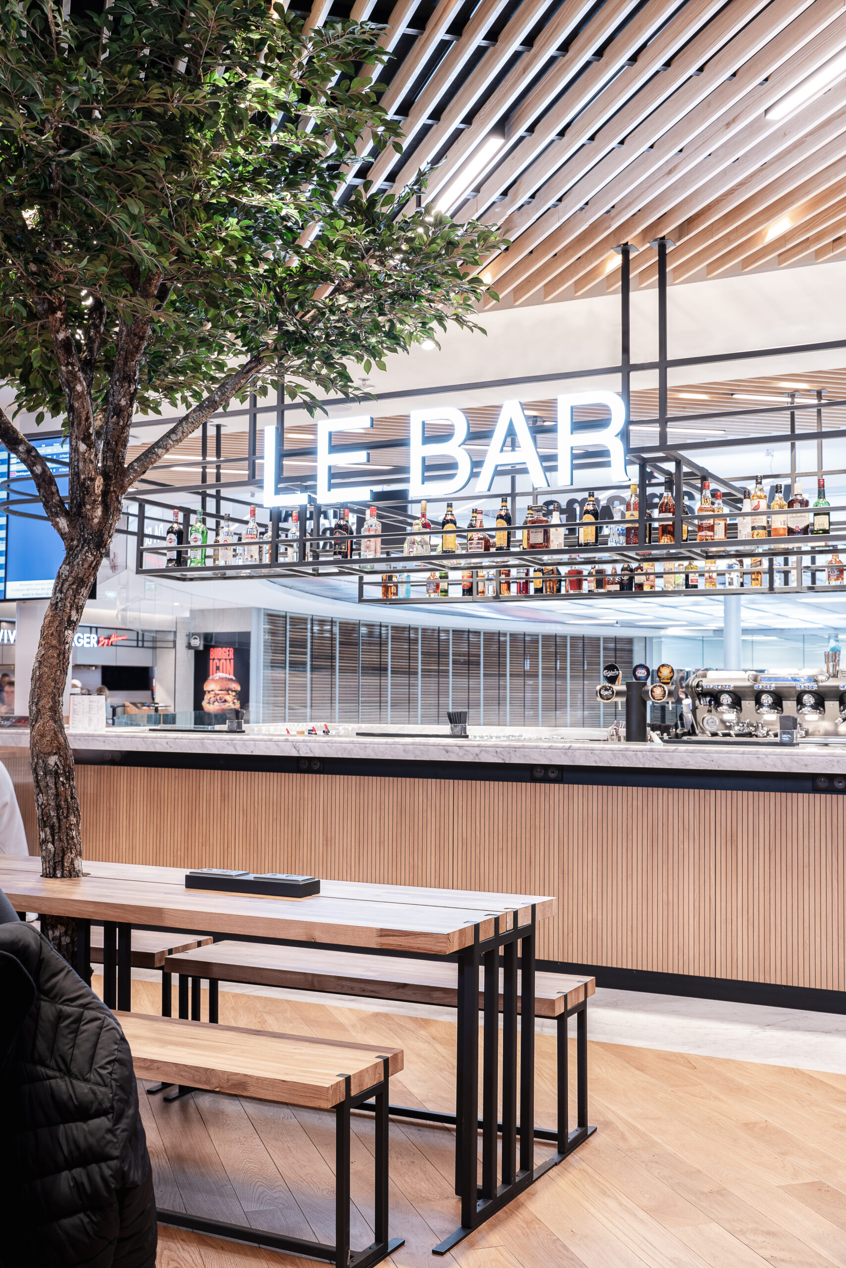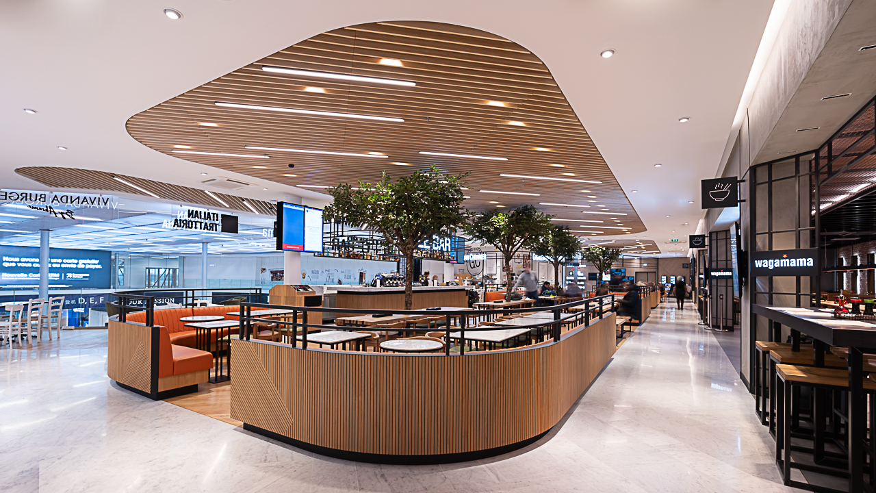 Dans le cadre de la refonte du terminal 3 de l’aéroport d’Orly, nos avons collaboré avec l’Aéroport de Paris, pour faire naître un Foodcourt de 1000m2 en plein cœur du terminal. Un projet d’envergure pour faire cohabiter 5 enseignes food et un bar aux univers très différents et singuliers. La zone de restauration commune porte un concept frais et intemporel, pensé comme un véritable lien entre les différentes enseignes.